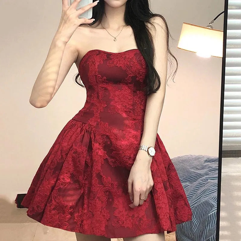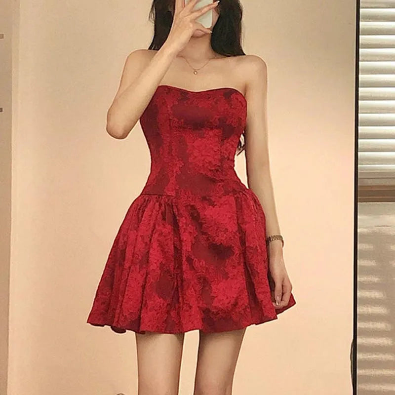 This French Style Dress features a vintage print, strapless neckline, Slash neck, regular fit, non-stretchable Polyester fabric, and a length above the knee.